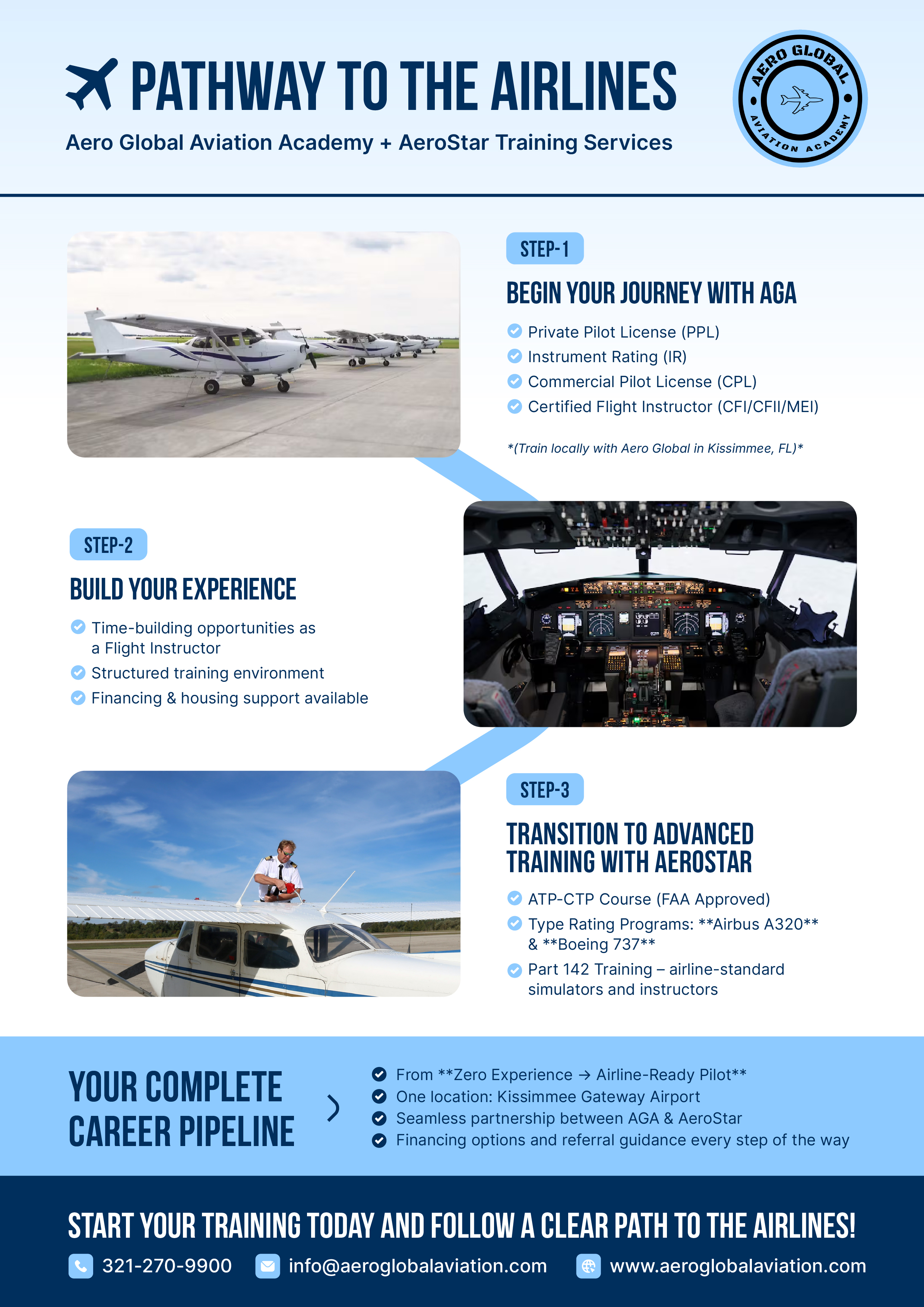 From zero experience to airline-ready pilot. Train locally with Aero Global Aviation Academy (AGA) from Private Pilot through CFI, then transition to advanced Part 142 training—ATP-CTP and type ratings (Airbus A320 and Boeing 737).